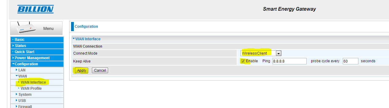 Click Wan Interface > Set Connect Mode to Wireless Client > Tick the Keep Alive option > Click Apply.