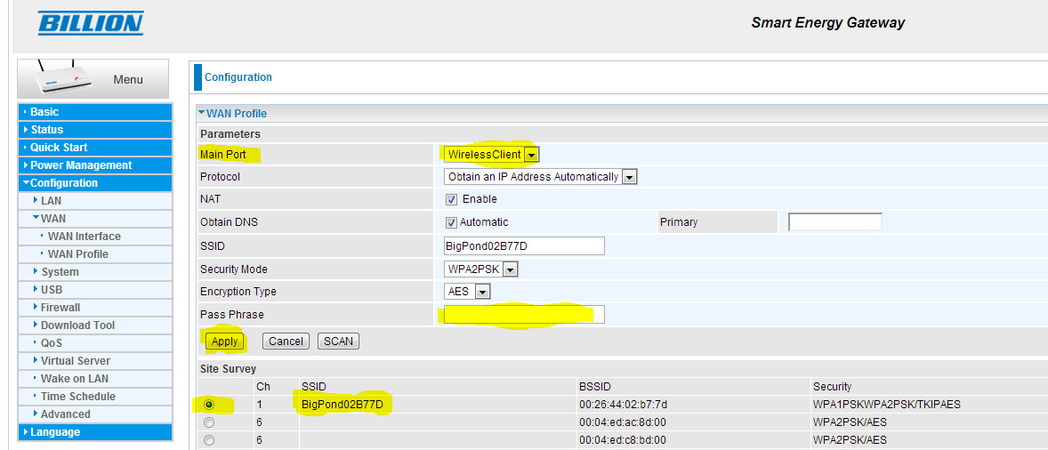 Change the Main Port to Wireless Client > Select your wireless network from the Site Survey > Enter the wireless password into the Pass Phrase field > Click Apply.
